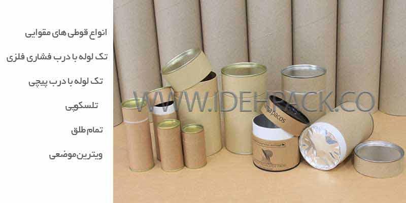 قوطی مقوایی یکی از بسته بندی های جدید در دنیا و ایران به شمار می رود بسته بندی استوانه ای که از مقوا ساخته شده است و این بسته بندی مورد توجه بسیاری قرار گرفته است این نوع قوطی ها برای بسته بندی محصولات مختلف از جمله بسته بندی غلات ، بسته بندی قهوه، بسته بندی آرایشی پودر دکلره ، بهداشتی ماننتد کرم ها ، شامپوها، بسته بندی تجهیزات صنعتی، بسته بندی جوش، بسته بندی میل سوپاپ، بسته بندی لوازم صنعتی، بسته بندی خشکبار، بسته بندی پسته ،بسته بندی انجیر،بسته بندی لوازم التحریر، بسته بندی دمنوش