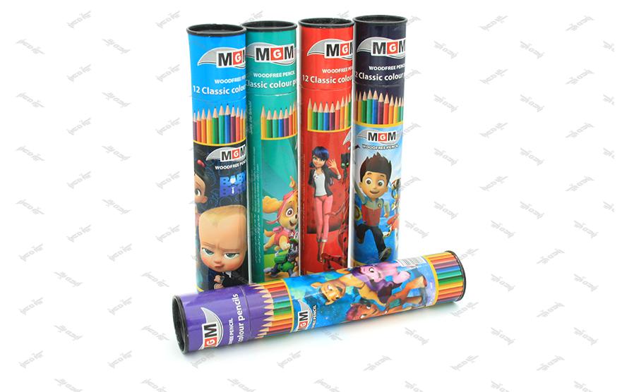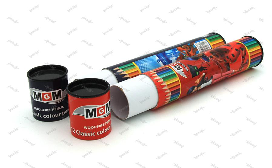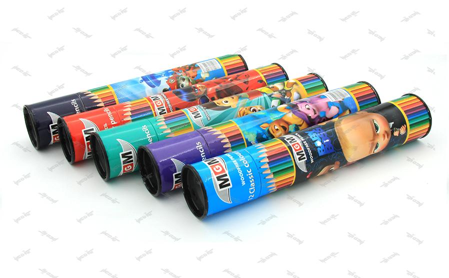 این نوع بسته‌بندی استوانه‌ای با بدنه چندلایه مقاوم و چاپ اختصاصی، برای محصولات مختلف مانند مداد رنگی، ماژیک، مداد شمعی، پاک‌کن، تراش و ست لوازم‌التحریر کودکانه استفاده می‌شود. طراحی گرافیکی رنگارنگ و کودک‌پسند، باعث می‌شود این قوطی‌ها علاوه بر محافظت، جذابیت بیشتری در قفسه فروشگاه‌ها داشته باشند.